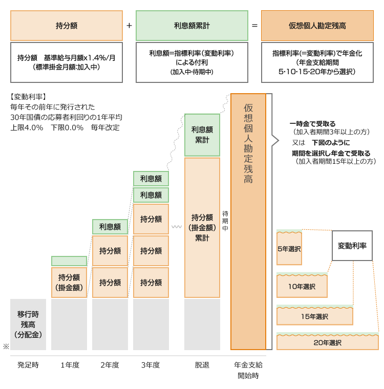 基金加入期間中の持分額(掛金)と利息を加算した「元利合計額」を給付するキャッシュバランスプランを採用しています。